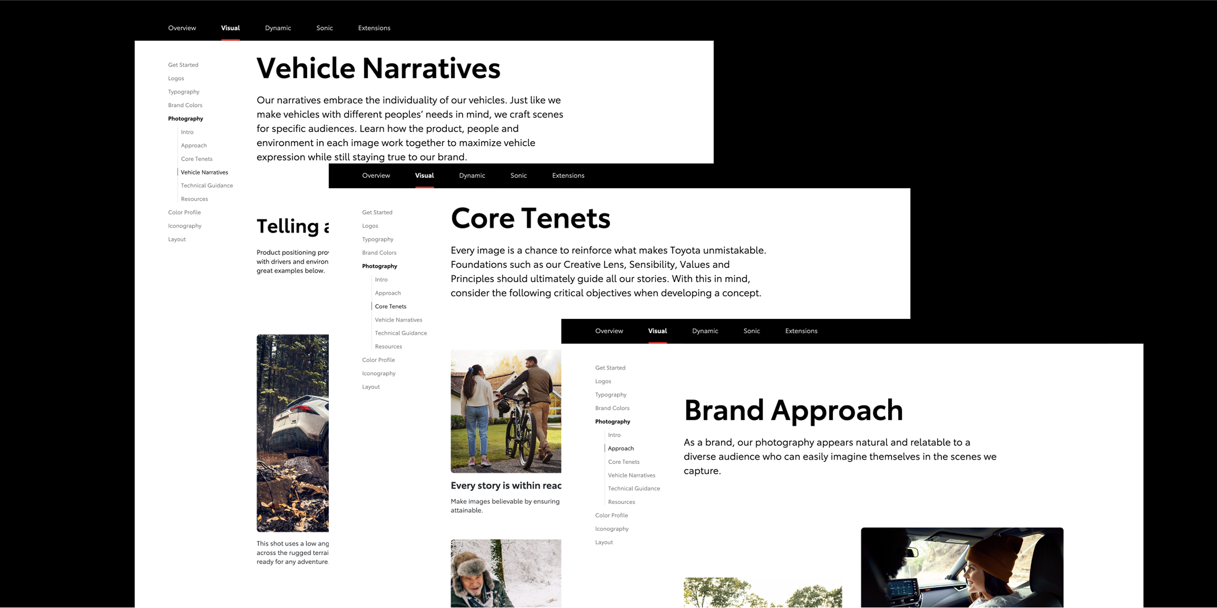 Building out the photography guidelines was a broad challenge that took time to narrow down into something clear. We started with Toyota’s larger brand ideals and worked through how those could be expressed visually across different types of photography. Through a lot of iteration, we landed on core areas that shaped the system.